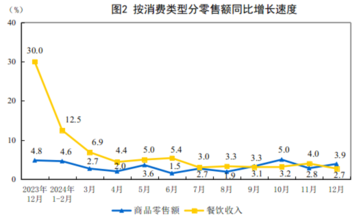 按消费类型分,12月份,商品零售额39623亿元,同比增长3.9%;餐饮收入5549亿元,增长2.7%。2024年,商品零售额432177亿元,比上年增长3.2%;餐饮收入55718亿元,增长5.3%。
