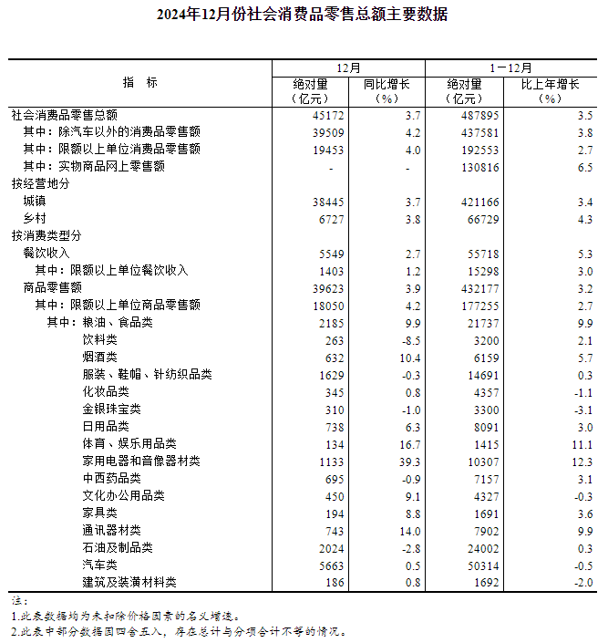 12月份,社会消费品零售总额45172亿元,同比增长3.7%。其中,除汽车以外的消费品零售额39509亿元,增长4.2%。2024年,社会消费品零售总额487895亿元,比上年增长3.5%。其中,除汽车以外的消费品零售额437581亿元,增长3.8%。
