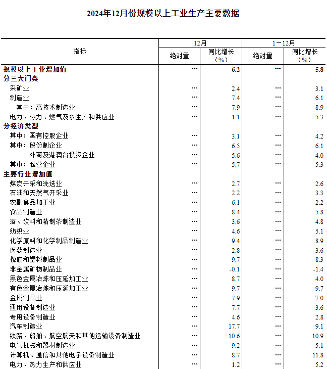 12月份,规模以上工业增加值同比实际增长6.2%(增加值增速均为扣除价格因素的实际增长率)。从环比看,12月份,规模以上工业增加值比上月增长0.64%。2024年,规模以上工业增加值比上年增长5.8%。