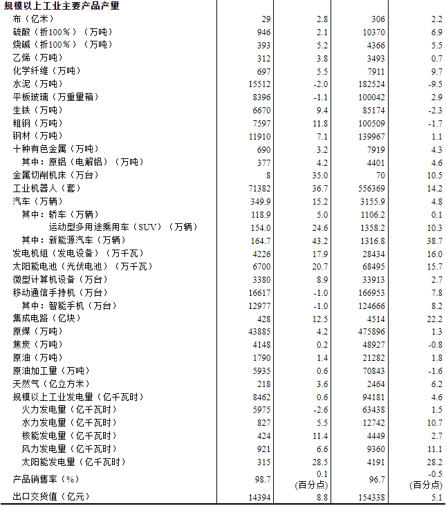 分产品看,12月份,规模以上工业619种产品中有396种产品产量同比增长。其中,钢材11910万吨,同比增长7.1%;水泥15512万吨,下降2.0%;十种有色金属690万吨,增长3.2%;乙烯312万吨,增长3.8%;汽车349.9 万辆,增长15.2%,其中新能源汽车164.7 万辆,增长43.2%;发电量8462亿千瓦时,增长0.6%;原油加工量5935万吨,增长0.6%。