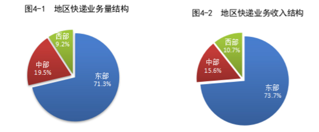 一季度,东、中、西部地区快递业务量比重分别为71.3%、19.5%和9.2%,业务收入比重分别为73.7%、15.6%和10.7%。与去年同期相比,东部地区快递业务量比重下降1.5个百分点,快递业务收入比重下降0.8个百分点;中部地区快递业务量比重上升0.9个百分点,快递业务收入比重上升0.5个百分点;西部地区快递业务量比重上升0.6个百分点,快递业务收入比重上升0.3个百分点。