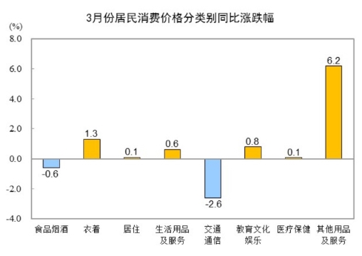 3月份,全国居民消费价格环比下降0.4%。其中,城市下降0.4%,农村下降0.3%;食品价格下降1.4%,非食品价格下降0.2%;消费品价格下降0.4%,服务价格下降0.4%。