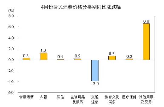 其他七大类价格同比六涨一降。其中,其他用品及服务、衣着、教育文化娱乐价格分别上涨6.6%、1.3%和0.7%,生活用品及服务、医疗保健、居住价格分别上涨0.2%、0.2%和0.1%;交通通信价格下降3.9%。