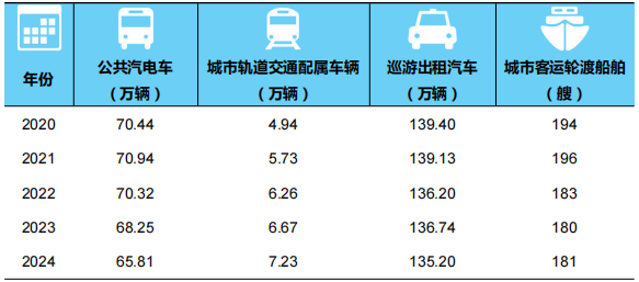 年末全国拥有公共汽电车65.81万辆,比上年末减少2.45万辆,其中纯电动车48.75万辆、增加1.36万辆,占公共汽电车比重为74.1%、提高4.7个百分点。拥有城市轨道交通配属车辆7.23万辆,增加0.56万辆。拥有巡游出租汽车135.20万辆,减少1.54万辆。拥有城市客运轮渡船舶181艘。