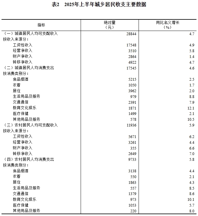 上半年,全国居民人均可支配收入21840元,比上年同期名义增长5.3%,扣除价格因素,实际增长5.4%。分城乡看,城镇居民人均可支配收入28844元,增长(以下如无特别说明,均为同比名义增长)4.7%,扣除价格因素,实际增长4.7%;农村居民人均可支配收入11936元,增长5.9%,扣除价格因素,实际增长6.2%。