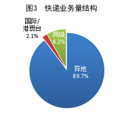 上半年,同城、异地、国际/港澳台快递业务量分别占全部快递业务量的8.2%、89.7%和2.1%。与去年同期相比,同城快递业务量的比重下降1.1个百分点,异地快递业务量的比重上升1.0个百分点,国际/港澳台业务量的比重上升0.1个百分点。