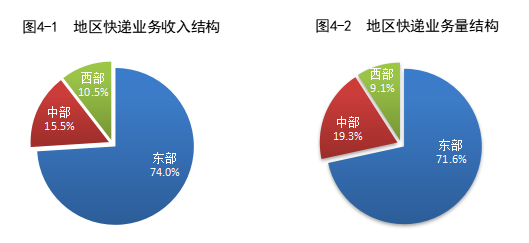 上半年,东、中、西部地区快递业务收入比重分别为74.0%、15.5%和10.5%,快递业务量比重分别为71.6%、19.3%和9.1%。与去年同期相比,东部地区快递业务收入比重下降0.8个百分点,快递业务量比重下降1.4个百分点;中部地区快递业务收入比重上升0.5个百分点,快递业务量比重上升0.8个百分点;西部地区快递业务收入比重上升0.3个百分点,快递业务量比重上升0.6个百分点。