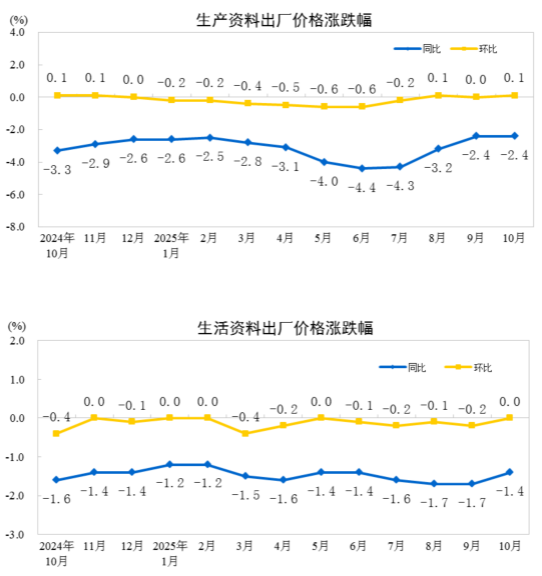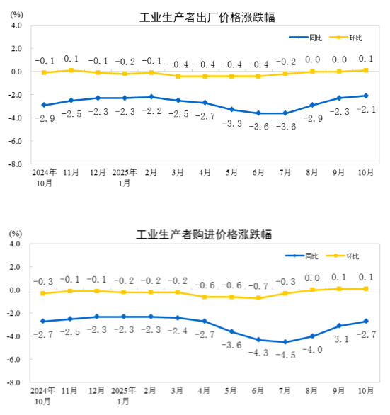 2025年10月份,全国工业生产者出厂价格同比下降2.1%,降幅比上月收窄0.2个百分点;环比由上月持平转为上涨0.1%。工业生产者购进价格同比下降2.7%,降幅比上月收窄0.4个百分点;环比上涨0.1%,涨幅与上月相同。1—10月平均,工业生产者出厂价格比上年同期下降2.7%,工业生产者购进价格下降3.2%。