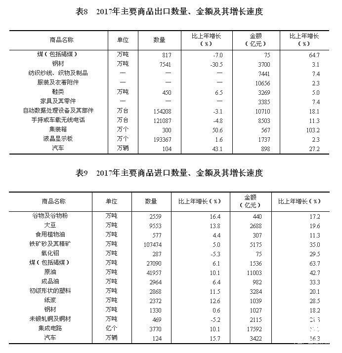 国家统计局发布《中华人民共和国2017年国民经济和社会发展统计公报》(以下简称《公报》)显示,2017年全年货物进出口总额277923亿元,同比增长14.2%。其中,出口153321亿元,增长10.8%;进口124602亿元,增长18.7%。