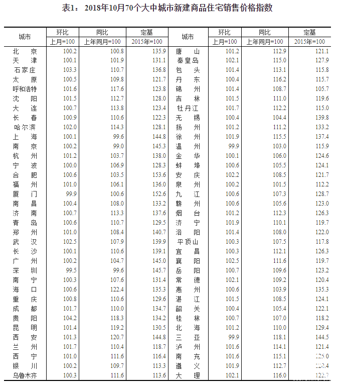 国家统计局近日发布了2018年10月份70个大中城市商品住宅销售价格变动情况统计数据,2018年10月份商品住宅销售价格总体稳定。