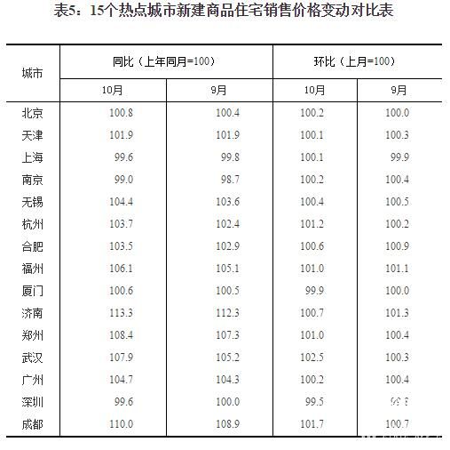 10月份,15个热点城市新建商品住宅销售价格环比下降的城市有2个,与上月相同,最大降幅为0.5%;上涨的13个,增加 2个,最高涨幅为2.5%。同比下降的城市有3个,比上月增加1个,最大降幅为1.0%;上涨的12个,与上月相同,最高涨幅为13.3%。