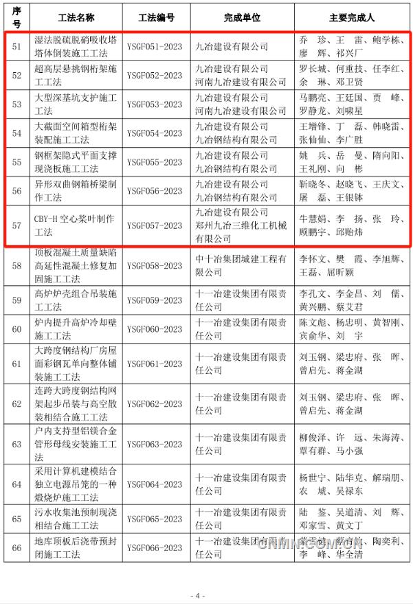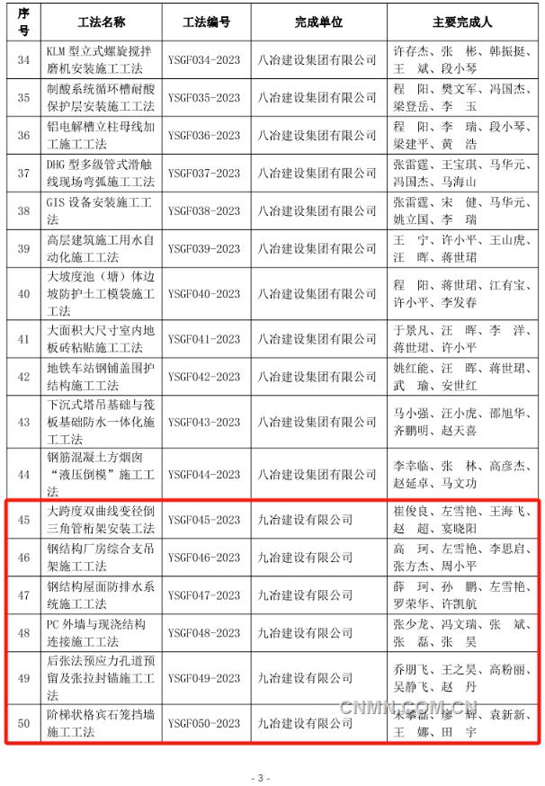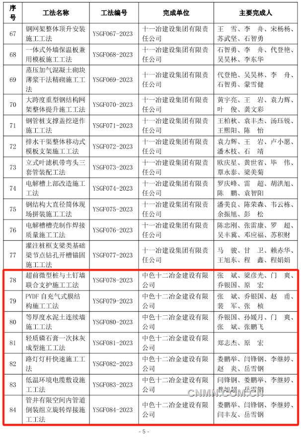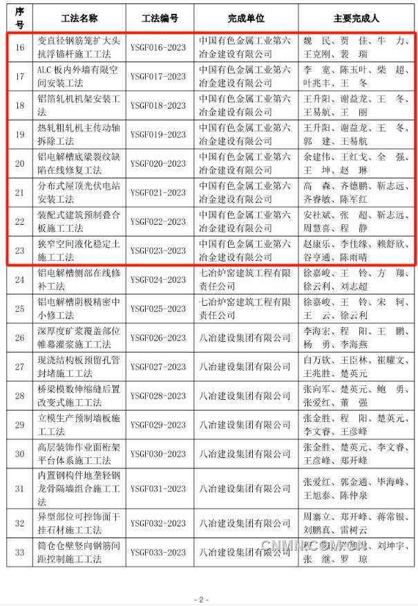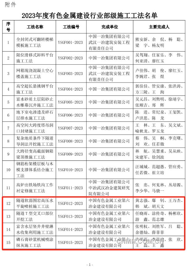 近日,中国有色金属建设协会公布2023年度部级施工工法名单,经企业申报、专家评价、集中评审、网上公示等程序,中铝国际所属六冶、九冶、十二冶、天津建设、中铝国际南方工程等单位申报的44项工法榜上有名。