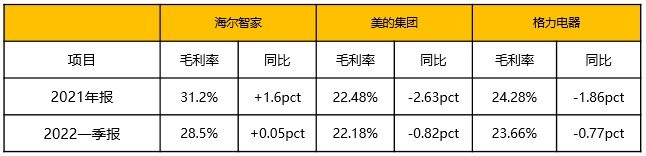 因为过去两年,受到大宗商品涨价影响,行业的利润空间被大幅挤压,毛利率整体呈现负增长态势。从已发布财报的企业看,无论是2021年还是2022一季度,毛利率都出现了不同程度下滑,平均降幅在2-3个百分点左右。