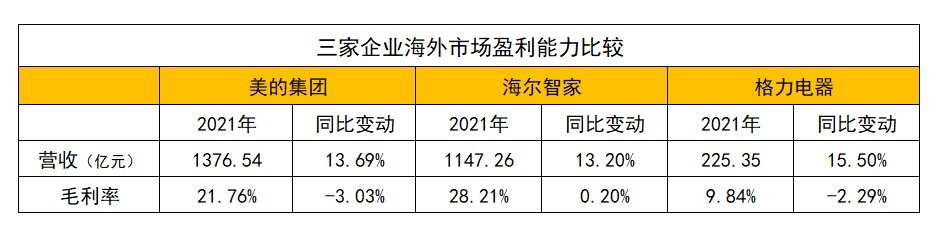 海尔智家毛利率增长的另一个重要原因是海外盈利能力的持续提升。2021年报显示,海尔智家海外经营利润同比增长48.1%,经营利润率达5.2%,同比提升1.2个百分点,盈利能力持续超代工;毛利率达28.21%,同比提升0.2个百分点;美的集团和格力电器海外毛利率则同比下滑3.03%、2.29%。