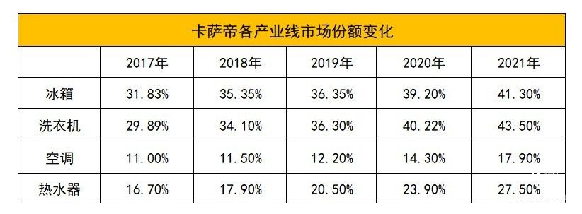 另据中怡康数据,2021年卡萨帝在高端市场冰箱、洗衣机、空调、热水器等细分赛道的占有率均达到历史最高。