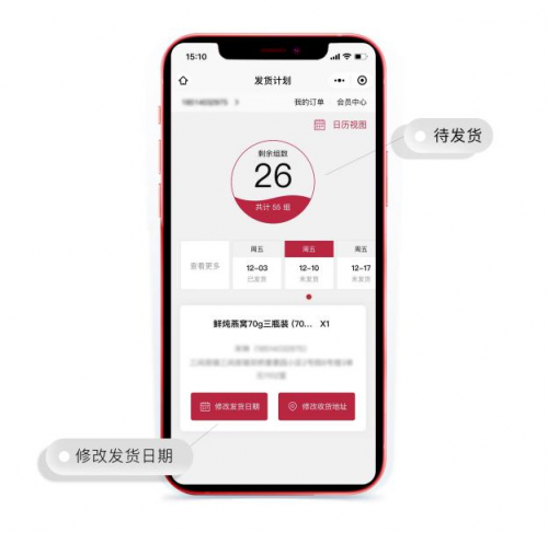 此外,小仙炖还创新推出周期滋补服务模式,引入周期订阅服务,用户按年、按月订购,小仙炖每周新鲜炖煮、冷鲜配送。同时,小仙炖开发了“自助发货调整“小程序,实现了用户需求与生产计划的精准匹配,用户可以随时修改自己的发货时间和收货地址,在休假、出差等场景随意切换,帮助用户在快节奏的生活中养成周期规律服用的滋补习惯。