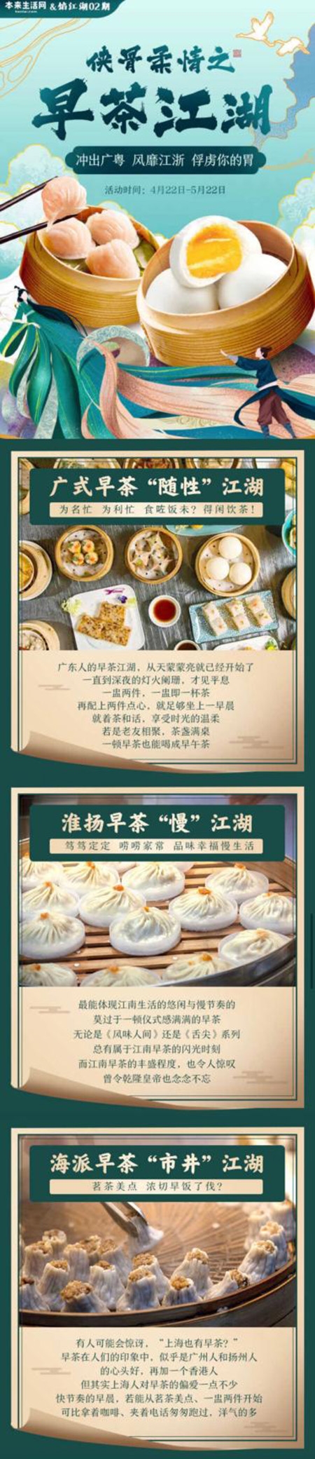 此外,本来生活网“馅江湖”第二期:侠骨柔情之早茶江湖初夏开擂。江湖中的“随性派”广式早茶、“精致派”淮阳早茶,蟹粉包配咖啡的“洋气派”沪上早茶,相聚本来生活网一较人气高下。这里有经典广式茶点莲蓉包、叉烧包,以及江南地区早点必备的生煎、汤圆、小笼包等,各种风味一应俱全,方便快捷。