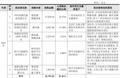 根据招股书,云从科技2021年的前五大供应商为中时讯通信建设有限公司、深圳市国电科技通信有限公司、加减信息科技(深圳)有限公司等,采购内容主要为服务器、摄像设备、公有云、施工服务等。