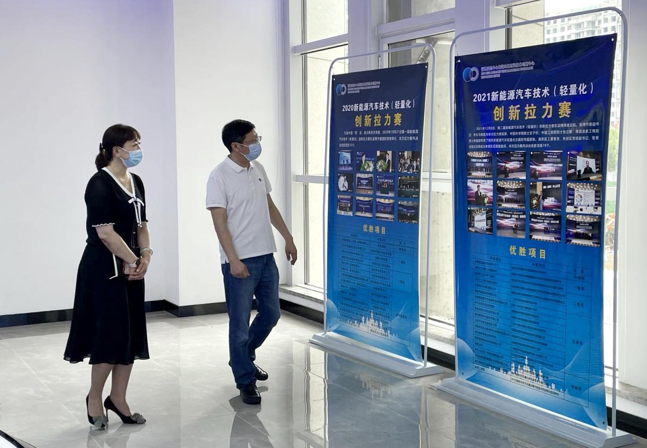 在国创连界技术转化服务中心,国创(淄博)中心副院长许烨介绍了中心成立的一年半时间里,在技术研发、技术转化、产业引进等方面取得的成绩;并向邹副区长介绍展示了样件的性能参数、技术方向和应用方向;以及国创(淄博)中心通过举办两届次新能源汽车技术(轻量化)创新拉力赛的选取、引进优质项目的情况。