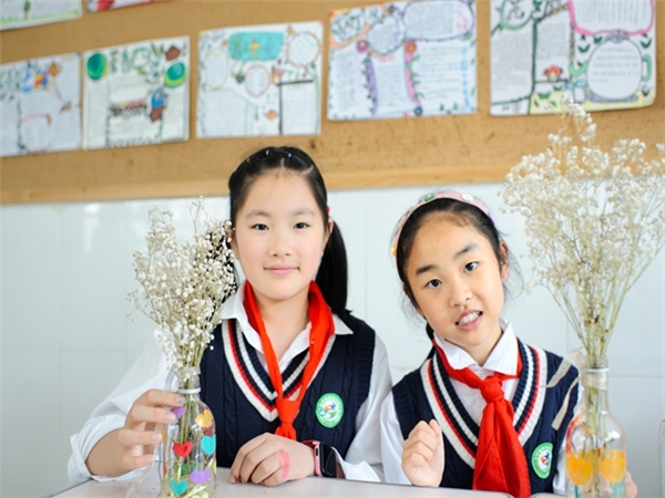 图为:实验二小孩子们展示DIY花瓶 (王艳 摄)