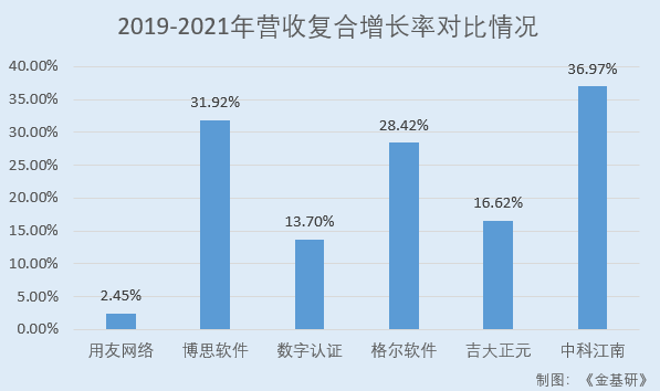 据东方财富Choice数据,2019-2021年,中科江南同行业可比公司用友网络科技股份有限公司(以下简称“用友网络”)的营收复合增长率为2.45%;福建博思软件股份有限公司(以下简称“博思软件”)的营收复合增长率为31.92%;北京数字认证股份有限公司(以下简称“数字认证”)的营收复合增长率为13.7%;格尔软件股份有限公司(以下简称“格尔软件”)的营收复合增长率为28.42%、长春吉大正元信息技术股份有限公司(以下简称“吉大正元”)的营收复合增长率为16.62%。