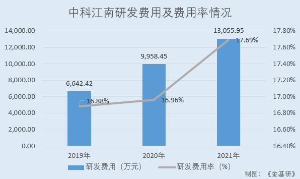 2019-2021年,中科江南研发费用分别为6,642.42万元、9,958.45万元和13,055.95万元,占营业收入比重分别为16.88%、16.96%、17.69%。
