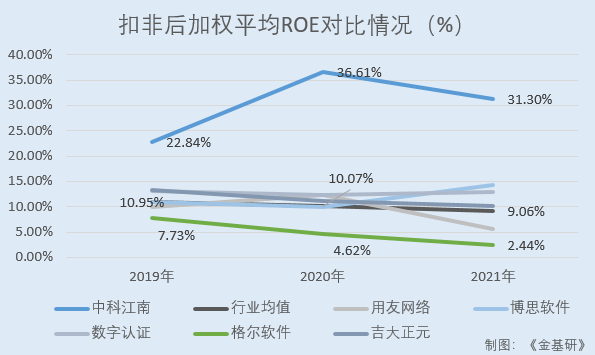 同期,中科江南同行业可比公司用友网络的扣非后加权平均ROE分别为9.86%、12.29%、5.58%;博思软件的扣非后加权平均ROE分别为10.85%、9.92%、14.21%;数字认证的扣非后加权平均ROE分别为13.06%、12.37%、12.87%;格尔软件的扣非后加权平均ROE分别为7.73%、4.62%、2.44%;吉大正元的扣非后加权平均ROE分别为13.23%、11.13%、10.2%。2019-2021年,上述五家公司的扣非后加权平均ROE均值分别为10.95%、10.07%、9.06%。