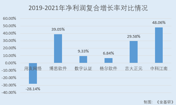 同期,中科江南同行业可比公司用友网络的净利润复合增长率为-28.14%;博思软件的净利润复合增长率为39.05%;数字认证的净利润复合增长率为9.33%;格尔软件的净利润复合增长率为6.84%;吉大正元的净利润复合增长率为29.58%。