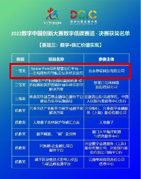 4月21日,由数字中国建设峰会组委会主办的2022数字中国创新大赛数字低碳赛道决赛落下帷幕。北京停碳科技凭借“SPACE PARK绿色智慧出行平台——全域微地形导航定位系统及应用”(以下简称”全域微地形导航“)荣获大赛数字低碳赛道”数字+碳汇价值实现”赛题最高奖!