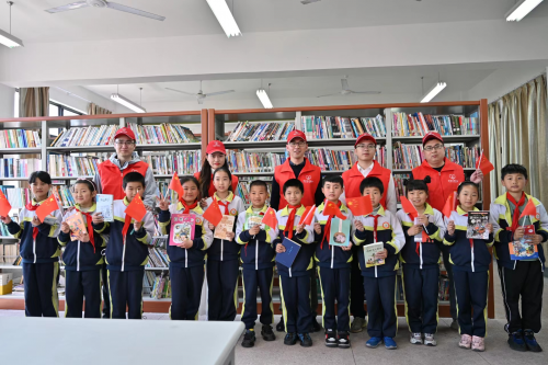 图为:“香溢”志愿者为孩子们送上全体职工自发捐赠的精美图书