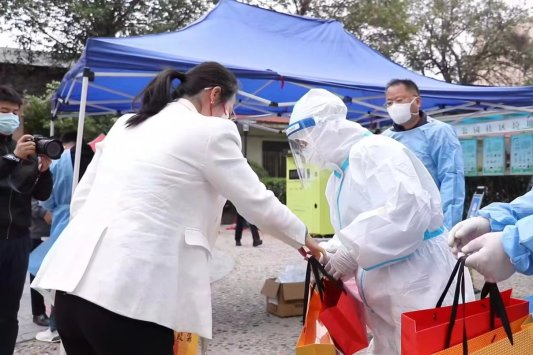 5月12日下午,东阿阿胶以及漱玉平民相关负责人带领团队,来到位于济南市历城区的建鑫花园和汇科旺园两个社区,为现场正在进行核酸检测的工作人员带来了复方阿胶浆、阿胶粉等产品,并喊出“提升免疫力 我们共同抗疫”的口号,为现场工作人员加油助力。