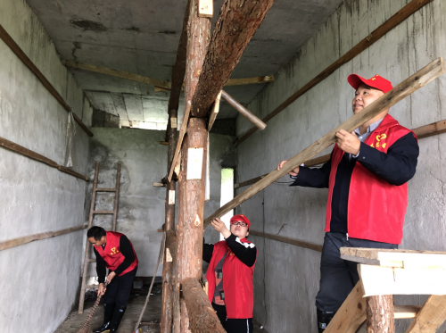 图为:志愿者对烤房进行杂物清理和挂烟粱修整(马光泽 摄)