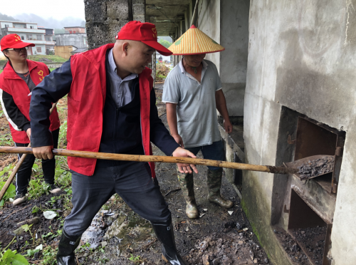 图为:志愿者帮助烟农修整排水沟(朱芳雨摄)