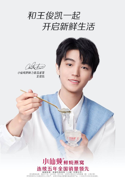 5月24日,小仙炖正式官宣王俊凯成为“新鲜力量品鉴官”,小仙炖表示,此次携手王俊凯是希望通过双方的共同努力,将更多美好的生活方式传递给大家。同时也为燕窝行业注入新鲜力量,传承中国千年滋补文化。