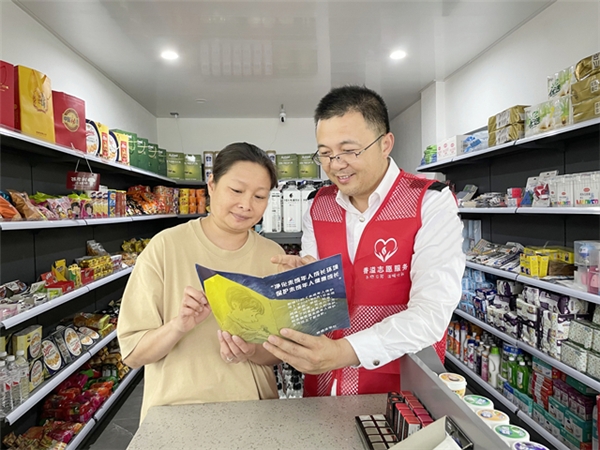 图为遂昌县烟草专卖局“香溢”志愿者向零售客户讲解《未成年人保护法》。巫晓俊摄