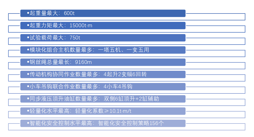 该产品攻克塔机行业双臂架模块化并联组合技术、双侧六缸同步顶升技术、四机构双变幅协同作业技术、四小车四吊钩协同作业技术、起升钢丝绳空间布局技术、顶升免配平技术、液压系统闭环平衡泵控技术、回转塔身并联组合结构技术、结构健康监测系统、智能吊钩辅助控制系统等10项世界首创技术。