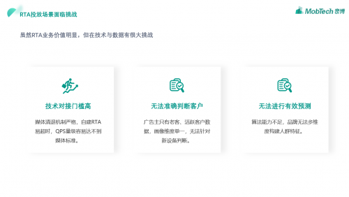 从RTA的概念不难看出,采用RTA投放模式,需要具备两个先决条件:首先,广告平台需要具备大曝光能力的广告平台,且具有较高的技术对接能力;同时,广告主需要具备海量的设备数据筛选能力,本身具有丰富足量的客户数据,且其客户画像数据维度丰富,支持各种“拉新”、“促活”、“交叉营销”等个性化场景;然而,在实际应用中,RTA投放场景面临诸多挑战,如技术对接门槛高、广告主缺乏数据无法准确判断客户、广告主数据不足以进行有效预测等。