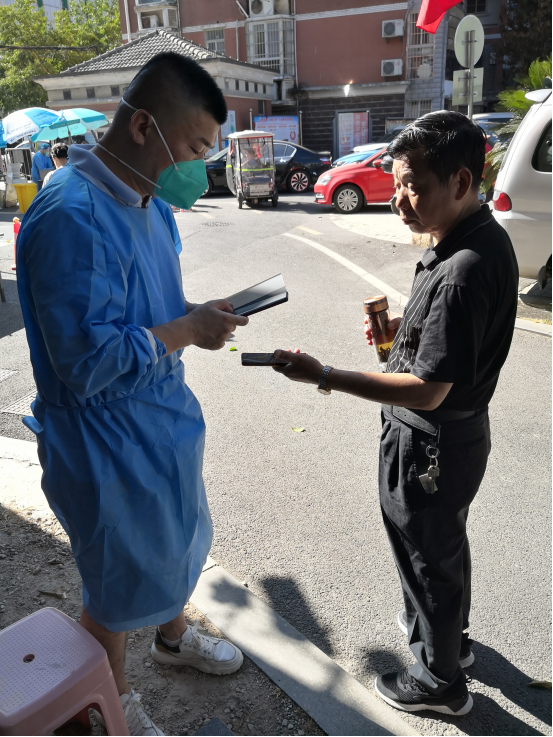 2022年国庆期间,汉阳烟草党员李清义下沉社区参与核酸检测信息采集