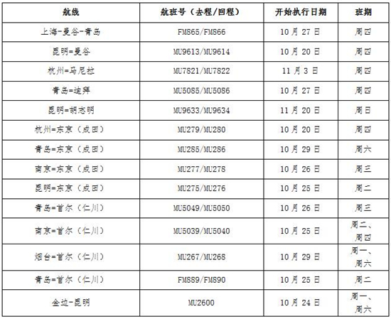 此次新增的国际航线将于10月20日起逐步开始执行,其中昆明—曼谷、杭州—东京成田航线20日起恢复,每周1班;金边—昆明航线24日起增至每周2班,昆明—东京成田、南京—首尔仁川、青岛—首尔仁川航线25日起恢复;南京—东京成田、青岛—首尔仁川航线26日增至每周1班;上海—曼谷—青岛、青岛—迪拜航线27日增至每周1班;青岛—东京成田、烟台—首尔仁川航线29日起执行。进入11月,东航还将陆续恢复和加密杭州—马尼拉、昆明—胡志明等国际航线。具体航班计划以东航官网实际查询为准。