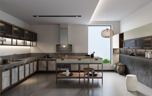橱柜主体设计打破传统定制门板单一呆板的固有印象,在采用传统形制的基础上,增添了极具现代时尚感的元素,原木+仿石纹设计柜门让整个橱柜产品所表达的意境立刻深邃起来;隐藏式拉手设计,内嵌中国文化元素图案的金属装饰片,与门板设计浑然一体。其考究的细节尽显简约大气,传递出意会东方的设计内涵。