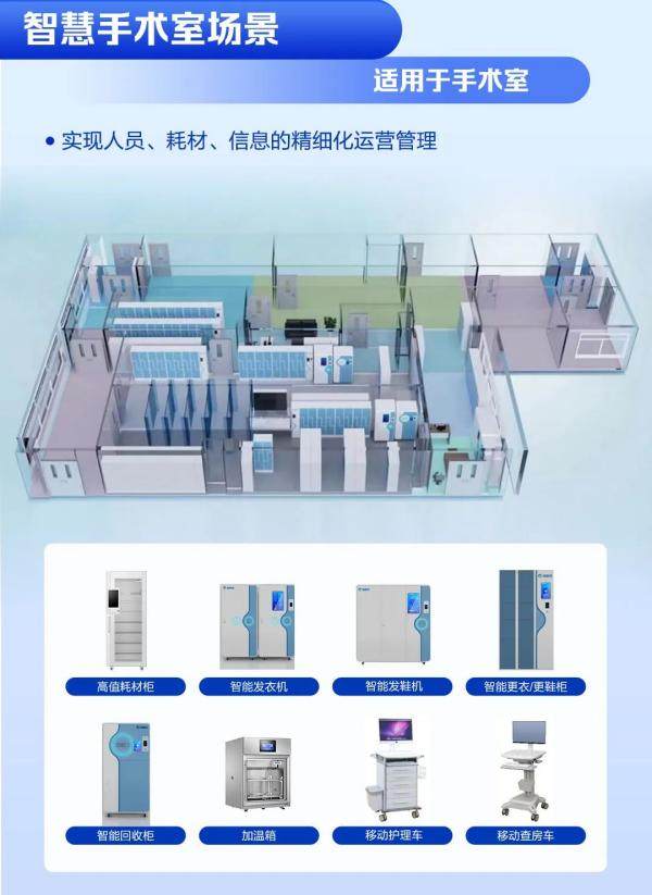 在智慧手术室中,智慧手术室场景方案通过布局高值耗材柜、移动护理车等产品,加强人员、衣物、环境感控,降低感染风险。