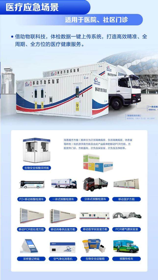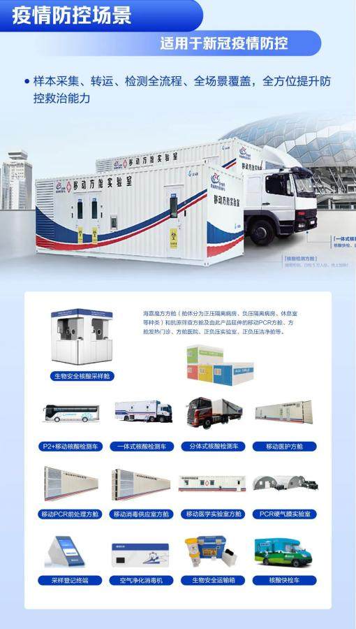 针对新冠疫情防控,疫情防控场景方案涵盖核酸采样舱、核酸采样车等不同爆款,实现样本采集、转运、检测全流程覆盖,全面提升防控救治能力。