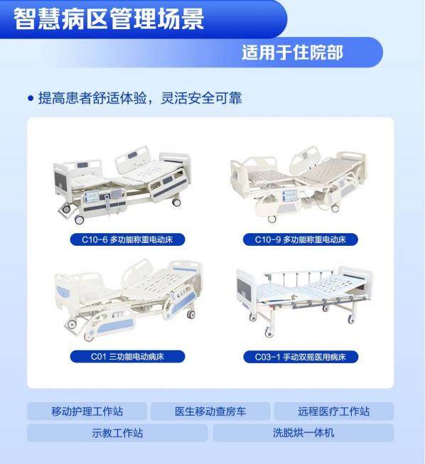 在智慧病区中,智慧病区管理场景方案通过医疗护理床等产品升级,实现对疾病/损伤/残疾的诊断、治疗、监护、缓解等。