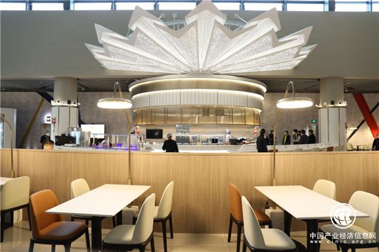 通过重新设计和规划,东航V23贵宾休息室的旅客动线设计和功能区域划分更合理。旅客完成安检后,右转步行约300米即可抵达V23贵宾休息室,省去了原先还需搭乘自动步道行走较长距离后才能抵达的不便。贵宾室整体设计风格简约大气,功能区域划分更明晰,与之前相比,升级后休息室内设置独立水吧区域和餐饮明档区域,其中位于餐区中庭核心区域的层叠灯光装置,灵感源自中式折扇,结合现代设计手法演绎,点亮餐台的同时,以不同色光间的切换烘托空间氛围感。在持续为旅客奉上“东航那碗面”的同时,更设置开放式自助餐区,旅客可尽情畅享各色时令精品佳肴及特色地方美食。