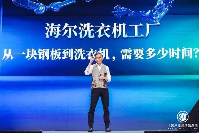 和大家分享一些数据,海尔在青岛有一家灯塔工厂,叫作洗衣机互联工厂。一台洗衣机从一块钢板到生产线,最后变成了一台洗衣机。需要多长时间?1天?10个小时?8个小时?3个小时?两个小时?答案是38分钟。而且这条生产线可以生产800元的洗衣机,也可以生产15000元的洗衣机。