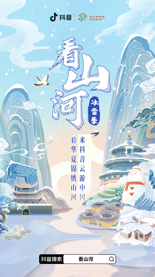 “来抖音云游中国,看华夏锦绣山河”,2022年11月28日至12月23日,抖音直播和抖音生活服务发起“看山河-冰雪季”活动,邀请旅游达人、主播通过短视频、直播等方式,向网友展示我国壮美山河的冬季美景、民风民俗。在近一个月的活动中,90多位导游累计开播2123场,直播时长3612万小时,吸引了超4692万人次观看。话题#冬日镜头下的大好河山 以3342万的播放量登上抖音种草榜第九位。