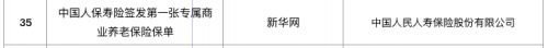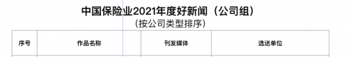2022年1月20日,在中国保险行业协会发布“中国保险业2021年度好新闻”评审活动中,人保寿险凭借《中国人保寿险签发第一张专属商业养老保险保单》,荣获“中国保险业2021年度好新闻(公司组)”奖项。