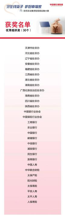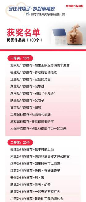 2022年8月3日,在处置非法集资部际联席会议办公室指导、《中国银行保险报》主办的2022年“守住钱袋子·护好幸福家”防范非法集资短视频征集大赛中,人保寿险报送的《别让悲伤随年迈一起到来》,荣获2022年“守住钱袋子·护好幸福家”防范非法集资短视频征集大赛“优秀作品奖”一等奖和“优秀组织奖”。