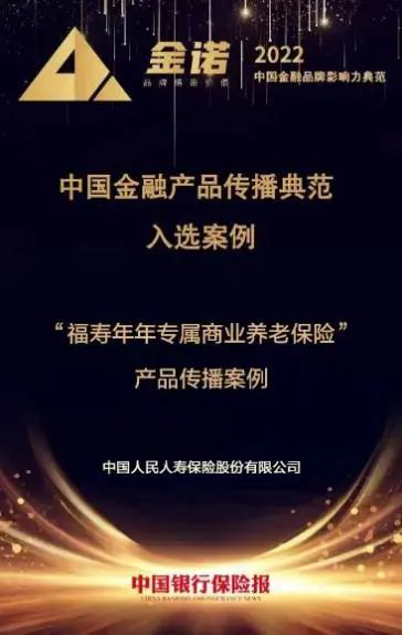2022年5月10日,在《中国银行保险报》主办的“2022金诺·第六届中国金融品牌影响力传播典范”活动中,人保寿险旗下的“福寿年年专属商业养老保险”产品传播案例,荣获“金诺·中国金融产品传播典范”殊荣。