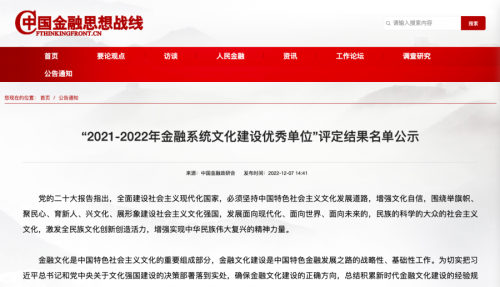 2022年12月8日,在中国金融思想政治工作研究会组织开展的“2021-2022年金融系统文化建设优秀单位”评定活动中,人保寿险荣获“2021-2022年金融系统文化建设优秀单位”。